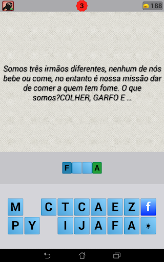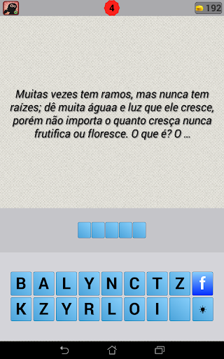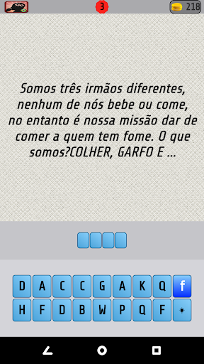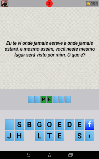 Kolektahin ang mga barya upang gastusin upang hulaan ang mga sagot, ibahagi sa iyong mga kaibigan, pag-uuri ng application o pag-download ng isang laro. Walang bayad. Gastusin ang iyong mga barya nang matalino. Hindi ko nais na bigyan ka ng gintong tropeo, ngunit sigurado ako na mas tiwala ka sa iyong mga kasanayan kapag nakumpleto mo ang laro. Higit sa 180 mga antas), o kung anong mukha ang nais mong gamitin ang mga laro ng utak Maghanap ng mga sagot. Tulad ng ito ay isang laro ng paghula, ito ay dinisenyo sa mga taong nais na palakasin at gamitin ang iyong katalinuhan. Sa larong ito ay makikita mo ang maraming uri ng mga puzzle.