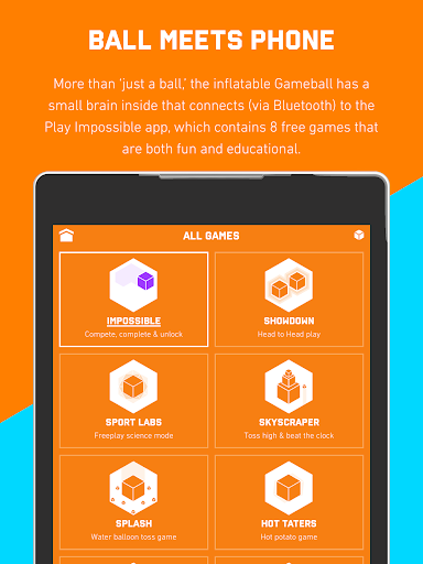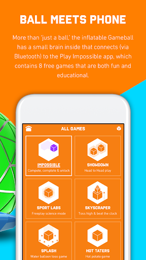 Ang Play Impossible GAMEBALL ™ ay isang aktibong sistema ng paglalaro na nagdudulot ng digital action sa loob at labas na may pitong libreng nakakonektang mga laro ng bola na maaari mong i-play sa iyong sarili o sa mga kaibigan. Higit sa 'isang bola lamang,' ang inflatable gameball ay naka-embed sa teknolohiya ng sensor ng patent na kumokonekta sa Play Impossible app sa pamamagitan ng Bluetooth, nagdadala ng bagong twist sa isang paboritong bagay at sport object.