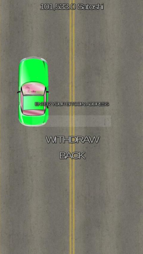Satoshi Race is a simple arcade that allows you to earn satoshi. Just drive the car through the obstacles and receive reward. Get 0.3 Satoshi for every passed car and additional 1 Satoshi for every fifth car. Withdraw your funds once a payout threshold will be reached.