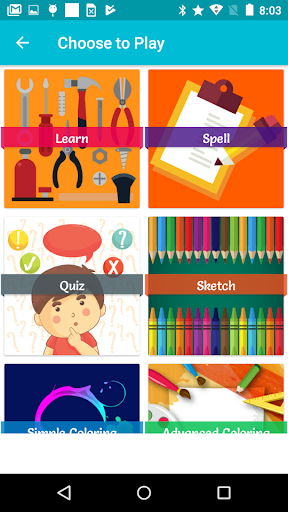 Full-length images of different types of tools for all the ages to learn, spell, draw, quiz, color and play games.