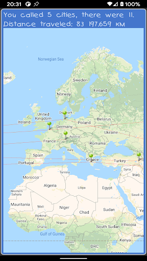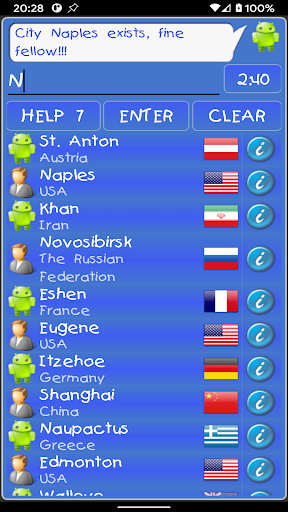 Sa larong ito, nakikipaglaro ka sa app at sumulat ng isang tunay na lungsod ng anumang bansa, ang pangalan kung saan nagsisimula sa liham na ito, na nagtatapos sa pangalan ng nakaraang lungsod.Ang dating pinangalanan na lungsod ay hindi maaaring magamit muli.Sa simula, pipili ng app ang anumang lungsod.Sa panahon ng laro, maaari mong gamitin ang materyal na sanggunian.Nagtatapos ang laro kapag naubusan ka ng oras upang sagutin o sa iyong kahilingan.Maaari kang pumili ng wikang Ruso o Ingles kung saan ka maglaro.
