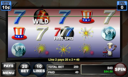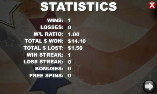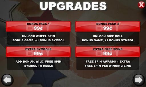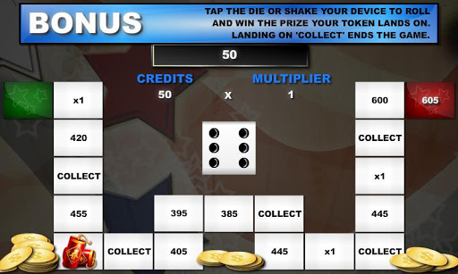 Mga Bituin at Stripes (5 reel slot machine) na may higit pang mga tampok, higit pang mga linya, mas mataas na mga limitasyon, at higit pang mga pagkakataon upang manalo kaysa sa dati! Mag-swipe up para sa isang max pusta kung ikaw ay pakiramdam masuwerteng. Mag-swipe pababa upang iikot ang reels. Hanggang sa 30 credits bawat linya at hanggang sa 15 linya sa bawat laro ay nagbibigay sa iyo ng gilid ng nagwagi! Nababago ang mga halaga ng kredito mula sa 1 ¢ hanggang $ 10. Araw-araw na mga gantimpala ng cash para sa pag-play. Kumita ng iyong paraan sa 60 trophies sa Araw ng Kalayaan na may temang slot machine.