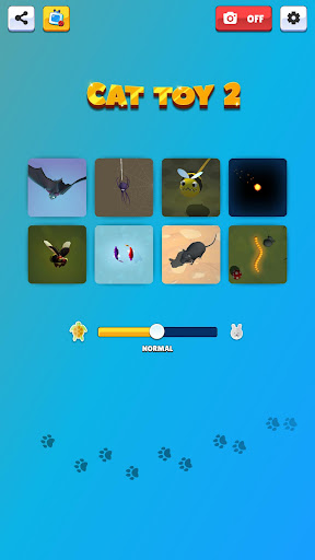 Mayroong 12 iba't ibang mga laro para sa mga pusa. Maaari mong ayusin ang kanilang bilis at hanapin ang pinakamahusay na opsyon para sa iyong alagang hayop. Kapag nakabukas ang photo mode, maaari mo ring i-save ang selfie ng iyong pusa sa iyong gallery kapag sinusubukan nitong hulihin ang mga laruan.