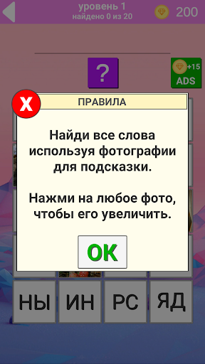 Sa bawat antas, mayroon kang access sa 20 mga larawan na dapat mong hulaan ang 20 mahiwagang salita upang dumaan sa antas.Ang mga larawan ay binuksan, isang tiyak na bilang ng mga larawan ay magagamit sa iyo, dahil hulaan ng iba sa iyo ang iba.Magagamit ang laro sa 7 wika: Ingles, Ruso, Espanyol, Italyano, Portuges, Aleman, Pranses.