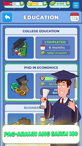 Hanapin ang mga unang paraan para magkapera, magkatrabaho, mag-aral, umasenso sa kumpanya, mag-trade sa stock market at manalo ng pera sa casino, bumili ng mga kotse, bahay, at eroplano, gawin ang kahit ano, pero maging head ng World Bank bago mamatay sa katandaan ang character mo.