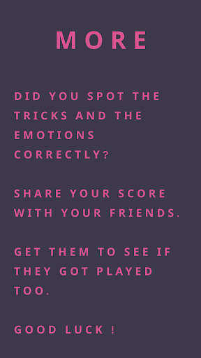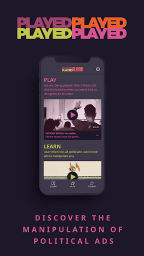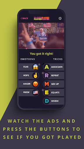 Nag-play ay nagbibigay-daan sa puntos mo kung makilala mo ang mga trick na manipulahin ang iyong mga emosyon sa mga pampulitikang ad.Maglaro ka ng isang ad at i-click sa bawat oras na sa tingin mo ang isang damdamin o makita ang isang lansihin.Ang layunin: Huwag kang maglaro!