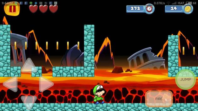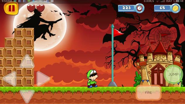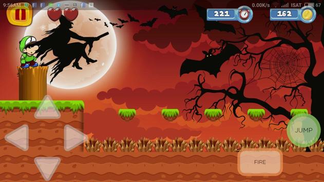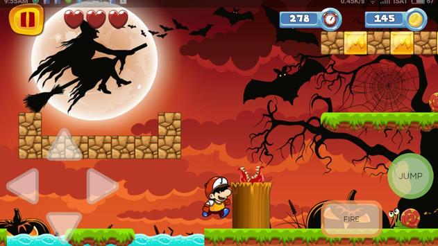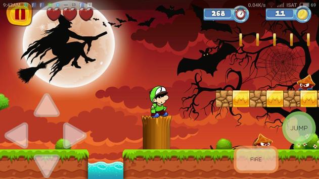 Super Jomblo runs and jumps across platforms and atop enemies in themed levels.These include a multitude of power-ups and items that give super boy special magic powers such as fireball-throwing and size-changing into giant and miniature sizes.