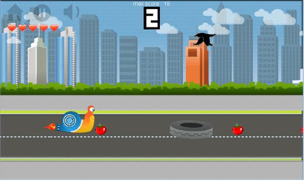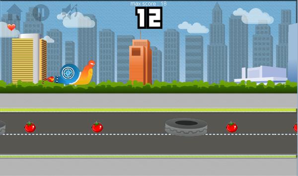 Welcome to this new adventure racing. Our turbo snail is on the highway and you must guide him to collect as many tomatoes as you can. Jump the obstacles that appear and avoid colliding with enemies crows.