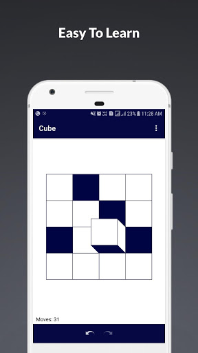 Your move is to roll the cube through 90 degree so that it moves to an adjacent square. If you roll the cube on to a filled square, the blue color is picked up on one face of the cube. If you roll a filled color face of the cube on to a blank square, the color is put down again. (In general, whenever you roll the cube, the two faces that come into contact swap colors.)