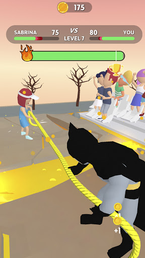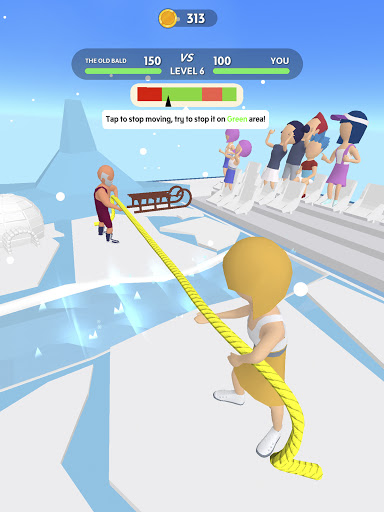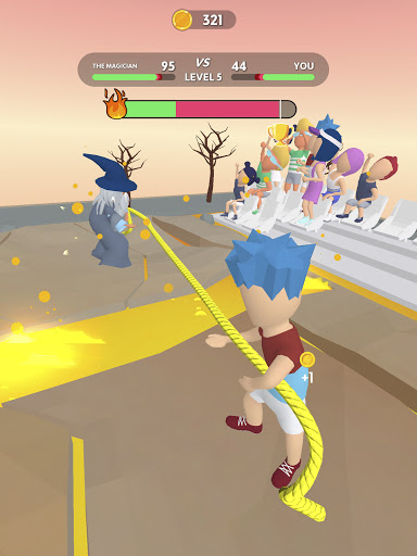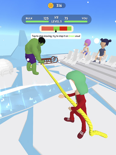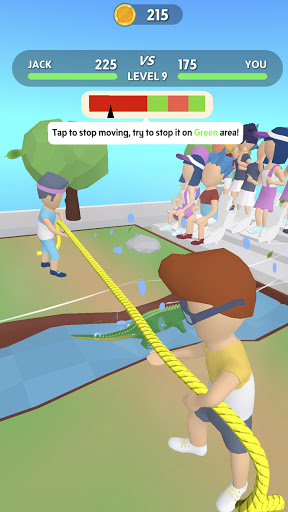 Subukan ang iyong lakas laban sa iba pang mga character sa Tug War Arena! Maaari mong subukan ang iyong lakas laban sa iba pang mga manlalaro mula sa buong mundo sa isang rope pulling contest sa Tug War Arena. Gamitin ang iyong daliri upang i-tap tap at i-drag ang iyong kalaban sa linya. Ang mas mabilis mong tapikin, mas maraming mga barya ang nakukuha mo!