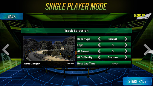 sa isang mabilis na lahi ng kotse, piliin ang uri ng track, antas ng kahirapan, at bilang ng mga lap at kalaban racers
