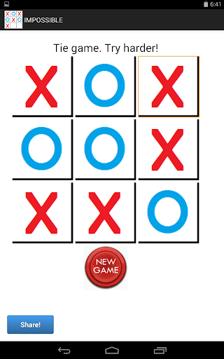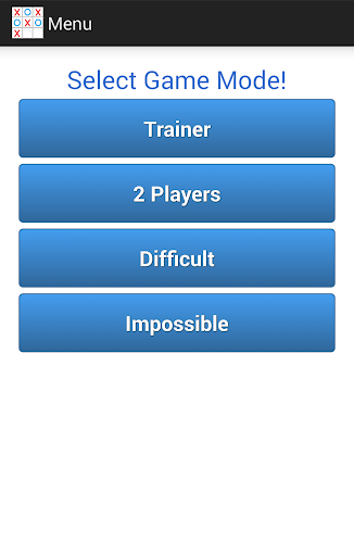 The most popular paper-and-pencil game! Get hours of fun with the 4 Game Modes: - TRAINER: With random answers (Easy) - 2 PLAYERS: You're both "X" and "O" - DIFFICULT: A good challenge - IMPOSSIBLE: Ready to never let you win! Enjoy!