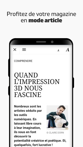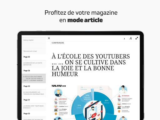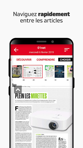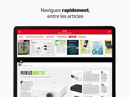 - Lisez votre magazine dédié à la tech avec confort comme un véritable journal papier en balayant simplement les pages horizontalement et en profitant pleinement de la qualité des écrans tactiles,