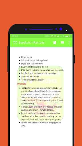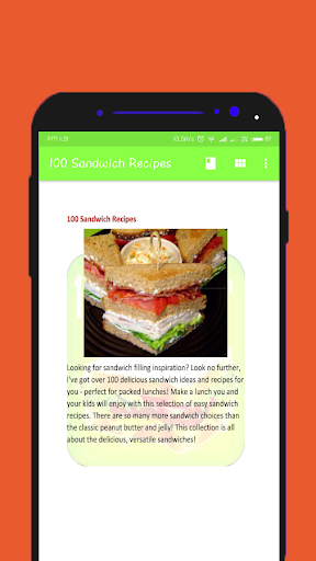 Bu sağlıklı sandviç tarifleri uygulaması, sandviçlerinizi yapmak için çeşitli tarifler bilmenizi sağlar; Okulda getirmek ve taşınabilir ve yemek kolay oldukları için çalışmak güzeller. Sandviçler, paketlenmiş bir öğle yemeğinin bir parçası olarak iş, okul veya piknik yapmak için kullanılan popüler bir öğle yemeği yiyebilir.