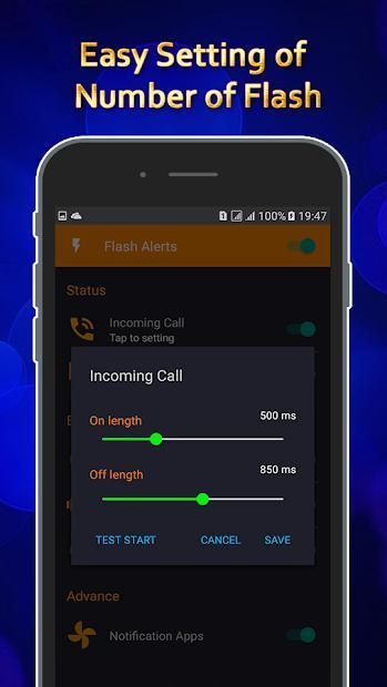 Advance - Allow change speed of flash light alert - Stop flash alerts with volume or power key - Turn off flash alerts when battery low, help you save battery