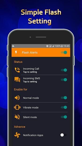 Common feature - Blink flash alerts when have call - Blink flash alerts when have SMS - Ringing flashlight when phone have incoming Call and incoming SMS and Notification - You can turn on or turn off service by manual over device status sound mode as Ring, Vibrate or Silent mode
