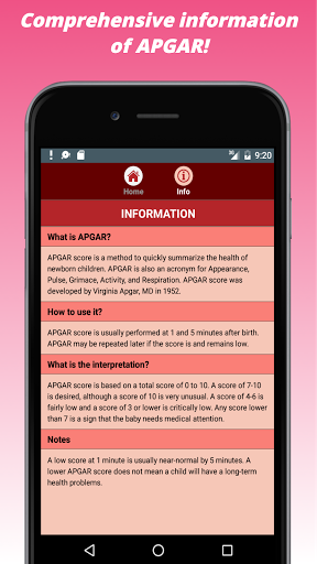 APGAR score is usually evaluated at 1 and 5 minutes after birth. In "APGAR Score Pro: Pediatric Newborn Assessment" apps, user can simply choose between several selections to calculate the APGAR score. "APGAR Score Pro: Pediatric Newborn Assessment" apps will also give the interpretation of the APGAR score. A score of 7-10 is desired (considered normal), 4-6 is fairly low, and 3 or lower is critically low. Any score lower than 7 is a sign that a baby needs medical attention. "APGAR Score Pro: Pediatric Newborn Assessment" also provide comprehensive information about the APGAR score.