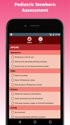The APGAR score is a simple method of quickly assessing the health and vital signs of newborn baby after delivery. The five criteria assessed in APGAR score are: A - Appearance (Skin Color), P - Pulse (heart rate), G - Grimace (Reflex Irritability / Response), A - Activity (Muscle Tone), R - Respiration (Breathing Ability). "APGAR Score Pro: Pediatric Newborn Assessment" apps will help health practitioners to quickly determine the APGAR score of newborn baby.