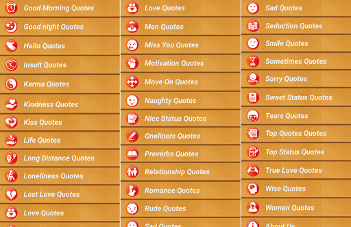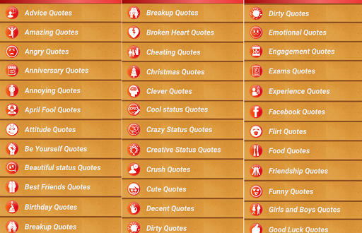 Tüm durum mesajları & amp;Alıntılar Ücretsiz Android uygulaması, tüm türlerin ve tüm doğa ve ruh hallerinden ve aşağıdaki türlerin onelinerlerinin şaşırtıcı koleksiyonudur:
