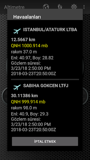 Bir barometre sensörü ile donatılmış cihazlar, deniz seviyesinden yüksekliğe dönüştürülen basınç yüksekliğini de elde edebilir. En hassas ölçümler için, referans değerini girerek veya uygulamanın en yakın hava alanındaki dinamik listesinden birini seçerek basınç yüksekliğini kalibre edin. Havaalanı verileri genellikle 20-30 dakikada bir güncellenir.