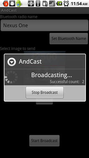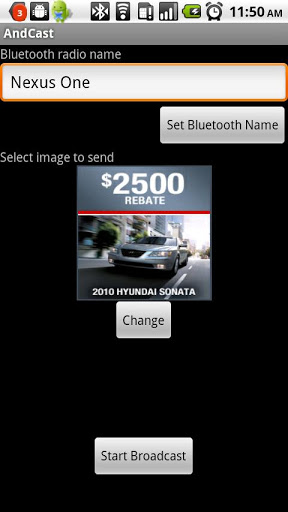 AndCast android bluetooth Proximity Marketing App Send ads to bluetooth phonesAndCast turns your Android2.1 or higher into a bluetooth proximity marketing tool You select an image to broadcast and it will scan for any discoverable bluetooth enabled phone within range and send your ads to the phones. Does not send to iPhone, Blackberry, or Android. May force close on some androids, known issue.