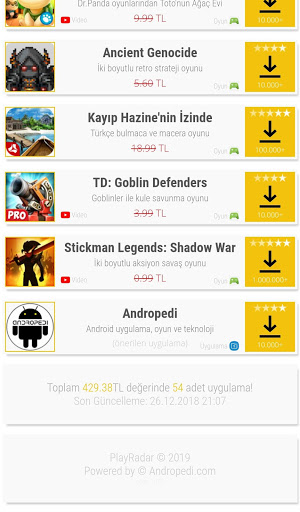 Paralı olan uygulama ve paralı oyunlar için internette apk aramanıza gerek kalmayabilir. Belki de ücretli olan uygulama veya ücretli oyun indirime girmiş ve ücretsiz olmuş olabilir. İşte PlayRadar "Ücretsiz Uygulamalar" size bu olanağı sağlıyor. Tek yapmanız gereken reklamsız ve ücretsiz olan uygulamayı yüklemek ve günlük olarak indirime giren uygulama ve oyunları kontrol etmek.
