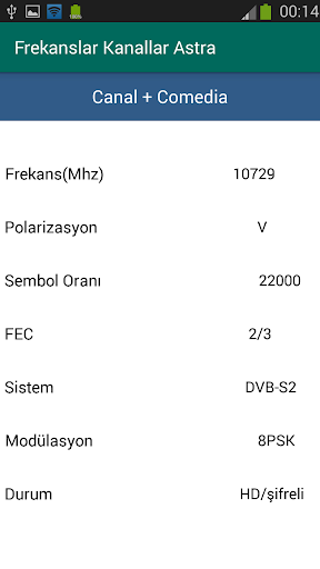 • Her kanal için detaylı bilgi (frekans - Polarizasyon - SR -FEC -Modulation -Sistem -. Kanal Durumu (SD veya HD / şifreli veya Temizle))