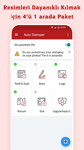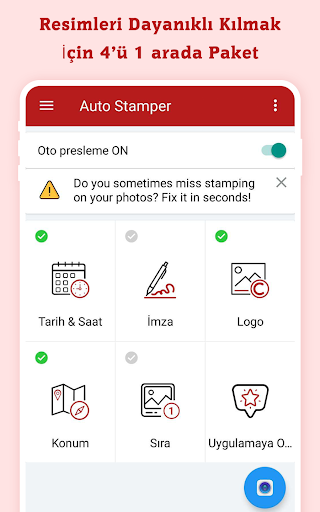 Öncesinde, fotoğraf damgalama için birçok kamera uygulamasını denediniz ve hiçbirisi Varsayılan Kamerayla çekilen resimlere özel kişisel damgaları ekleme profesyonelliği sağlamadı mı? Auto Stamper regi, format, konumlandırma ve boyut gibi özelliklerle zenginleştirilmiş tek uygulamadır.