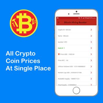 Bitcoin Mining Booster is Free Bitcoin Miner and Mining app which allow you to find best and free crypto currency and compare them and show you al crypto currency in an ordered form.