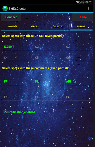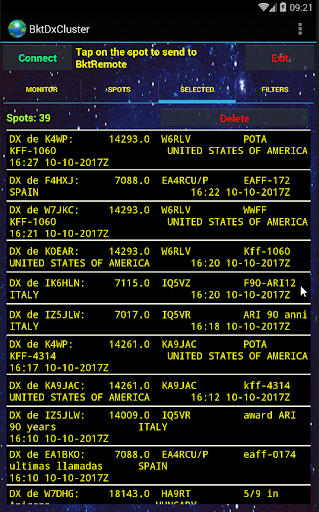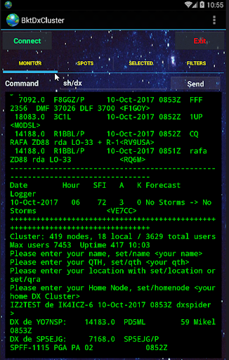 BKTDXCluster, Telnet DXSpider düğümlerine bağlanır ve DX noktalarının görüntülenmesini ve gönderilmesine izin verir (https://play.google.com/store/apps/details?id=bktremote.iz2BKT), alıcı-vericiyi frekansta ayarlayabilir.DX spot veya frekansı doğrudan alıcı-vericiden okuyarak bir yer gönderin.