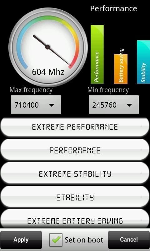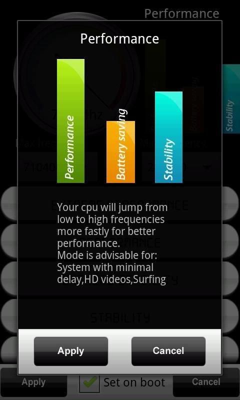 It is well known ,that CPU influences device performance , system stability or even battery consumption.If you are not proffesional it is hard to set up your CPU to achieve best performance (device speed),stability and minimalize battery consumption.CPU Pro contain 6modes which sets your CPU in a propriate way.Each mode will scan your availible governors (scalling),I/O schedulers and than automatically sets them with smart technology to achieve best speed,stability and battery life! ROOT IS REQUIRED !-Pro version only Application provides: ★Overclock -Allows you to set maximal and minimal freqiuencies 6 MODES !★Best performance Sets your cpu on maximal freqency all the time ,so it ensures maximal speed and performance Mode is advisable for: Playing games !★Normal performance Your cpu will jump from low to high frequencies more fastly for better performance Mode is advisable for: System with minimal delay,HD videos,Surfing !★Best stability Your cpu will be set up to factory settings. Mode is advisable for: Calling,sending SMS !★Normal stability Mode is just a little bit unstable than Best stability ,but on the other hand offers better performance and battery saving Mode is advisable for: GPS navigation !★Best battery saving Your CPU will be running on the lowest possible frequency all the time for the lowest battery consumtion. Warning:Performance will resolutely fall! Mode is advisable for: Stand by mode !★Normal battery saving Your cpu will jum from low frequencies to high more slowly and everythime you lock the screen sets tho lowest possible frequency Mode is advisable for: Normal use with extended battery life