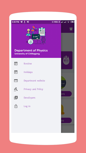 ⇨ Routine- You will find this feature in the navigation drawer menu. With this feature users can access to the class routine of Department of Physics, Chittagong University (CU).