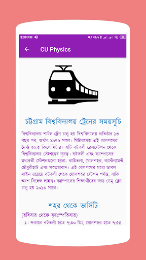 ⇨ Shuttle Schedule- You will find this feature in the home menu. With this feature users can access to the "Shuttle Train" schedule of Chittagong University (CU).