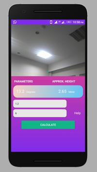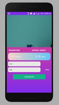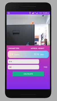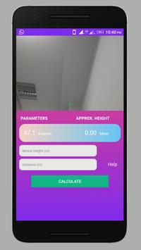 how "high" the position is. This application is a fancy way to measure the height of the object or someone. Use the camera to point the object and the application will give you a approx. height. Simply fill the height of the device from ground and distance between you and the object to measure and click calculate. That's it all.
