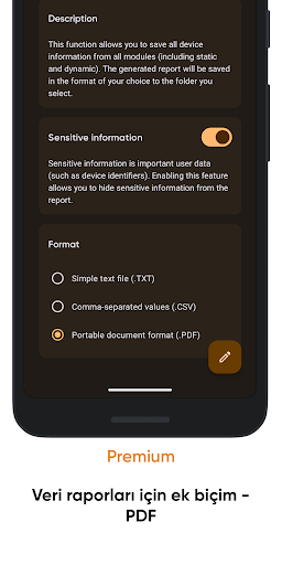 Cihazınızdan tüm bilgileri toplayın ve uygun herhangi bir yöntemi kullanarak paylaşın. Castro, TXT, CSV ve PDF (yalnızca Premium) formatlarını destekler ve anonim veya dinamik bilgileri otomatik olarak gizleme fırsatları sunar.
