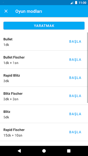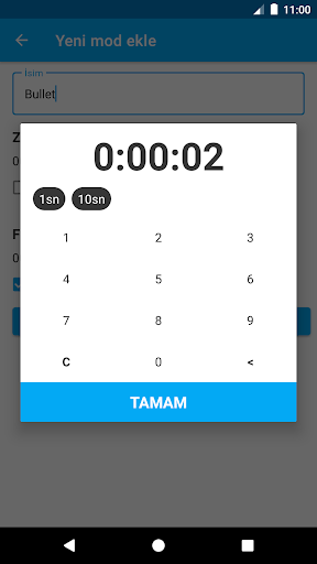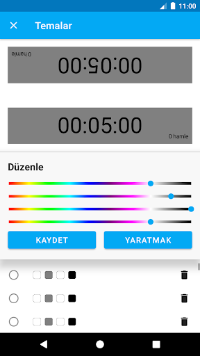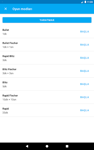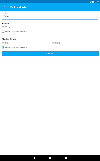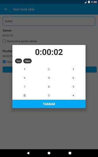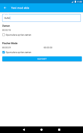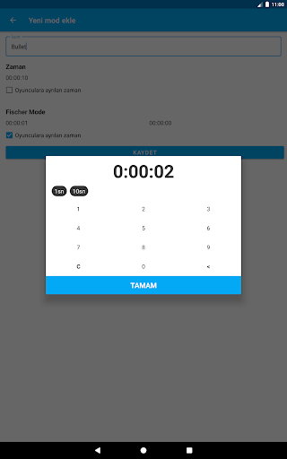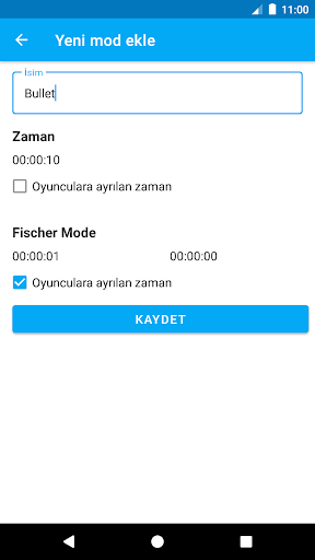 Aşağıdaki zamanlar önceden kuruludur: 1m, 1m 1s, 3m, 3m 3s, 5m, 15m 10s ve 25m. Kendi zaman modlarınızı hızlıca ekleyebilirsiniz. Oyuncu başına farklı zamanlar da desteklenir.
