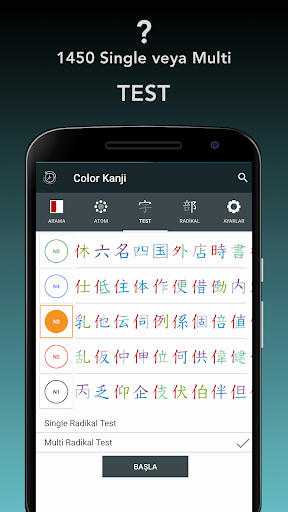 Her JLPT seviyesinde Single ve Multi Kanji Test; 1450 soru