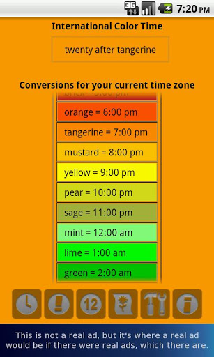This app implements International Color Time, which is a slightly silly but effective standard, intended to eliminate the confusion that accompanies trying to coordinate phone calls or other activities with people who live in other time zones around the world.