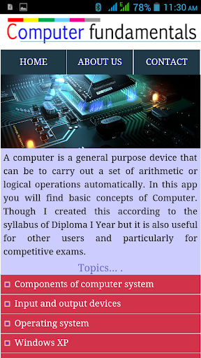 A computer is a general purpose device that can be to carry out a set of arithmetic or logical operations automatically. In this app you will find basic concepts of Computer. Though I created this according to the syllabus of Diploma I Year but it is also useful for other users and particularly for competitive exams.