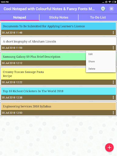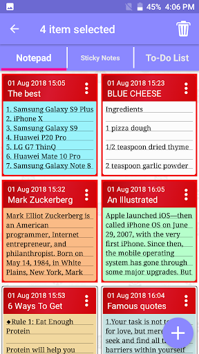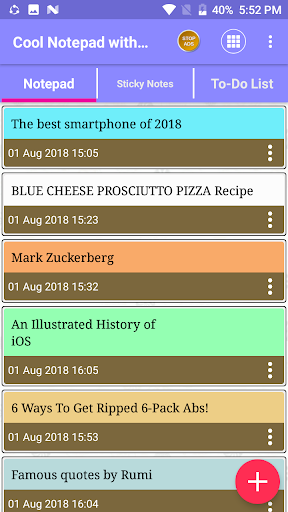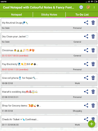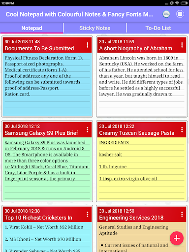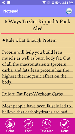 Basit düzlemin metin notları ve notu oluşturmanın yanı sıra, zengin metin formatı fantezi notları şık ve renkli yazı tipleri ile yazmanıza olanak tanıyan bu ücretsiz Cool Notepad ve Güçlü Text Editor uygulamasını indirin. Ayrıca, metinleri web sitesinden, txt doc pdf vb. Dosyalardan veya diğer uygulamalardan ve kaynaklardan kopyalayabilir ve bunları cep telefonunuzdaki not defterinize veya belgelerinize kaydedebilirsiniz.