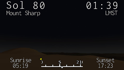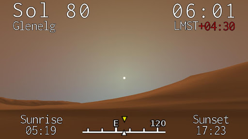 > Bu ilginç uygulama, Gale krater iniş sitesinde mevcut yerel ortalama güneş zamanını (veya yerel gerçek güneş zamanını) söyler ve RoVer'ın iniş tarihine göre Sol (Mars Day) numarasını gösterir.