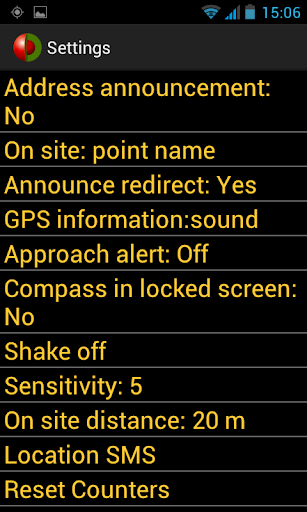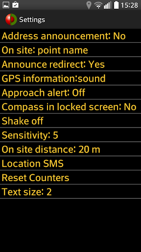Talking compass, automatically updated list of nearby points (OSM maps), Google points of interest, current location address, Google route navigation instructions and route recording.