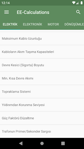 Bu uygulama elektriksel hesaplamalar, elektronik hesaplamalar, aydınlatma hesaplamaları, motor hesaplamaları, dönüşümler ve pin yapıları içerir.