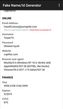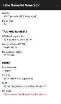 By using this app you will be able to generate Fake things like:- 1. Name 2. Address 3. Birth date 4. Phone no. 5. Email 6. Credit Card 7. Weight 8. Blood group 9. Favourite colour 10. QR code And some more info. Have Fun..