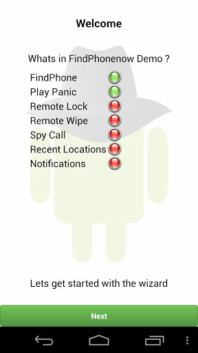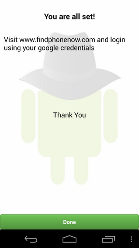 Find your device location, remote lock Remote Wipe,Play Panic,Spy Call and more Findphonenow help you find your device location, remotely wipe your device when stolen, remembers your location, Play Panic when lost and even make a Spy Call to any phone number Key Features: * Find Phone anywhere in the world * Remote Lock * Remote Wipe * Recent locations * Turn Off Notifications * Spy Call * Play Panic * IMEI and Device Model * Very Easy to use * Good Bye to SMS ! FindPhonenow FreeSupported Features: * Find Phone anywhere in the world * Play Panic * IMEI and Device Model Here are some ways you can use findPhonenow: - Use Find Phone to locate your device. - Use Play Panic to find your device if missing. - Use Recent Locations to get the history of device location. - Use Remote Lock to lock your device if you think your device is stolen. - Use Remote Lock to lock your device so that no one can access your device content when you are not around. - Use Turn off Notification to find your phone where it is switched off. This can be useful if someone steals your phone and tries to turn it off. - Use Spy Call to listen to background voice. Spy Call enables your phone to call to any number silently. - Use Remote Wipe to Reset your device and delete all your information How to use ? 1. Install the Application 2. Run the set up wizard 3. go to www.findphonenow.com and login. Findphonenow is only available for Android. *=========* *IMPORTANT* *=========* - Free Version will expire in 3 days. - You can activate upto 3 Devices. Loss or Damage to Phone FindPhonenow Developer(s) are not responsible for any damage caused to the device using the Application/Site. We are not responsible for NOT finding the device using the application/site when in emergency or otherwise. We are not be liable for any claim arising out of the lose of your device, application not working as expected.
