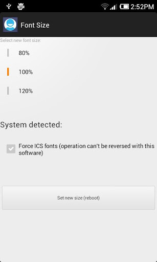 THIS APPLICATION IS FOR ROOTED PHONES ONLY.This is free version of Font Size editor IF YOUR TERMINAL DOESN39;T REBOOT AUTOMATICALLY, YOU CAN REBOOT IT MANUALLY, IT WILL WORKS Not waste MB of RAM This application changes the global font size It does not remain running in the background so it doesn39;t waste CPURAMBattery to keep your preferred font size.With this application you can change your system global font size.Supported dimension are expressed as a percentage compared to standard size:80100 original size120This is beta, not been tested much for now.quot;Force ICS fontsquot; is only for android 2.x, it will install robotofont from android 4 on your android 2 phoneIt39;s not tested for now, but should be ok. Will test in some days.TRY FULL VERSION FOR ALL FONT SIZE:60708090100110120130140