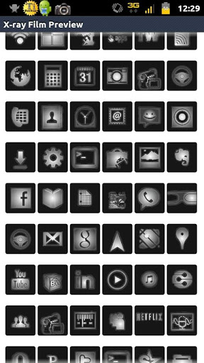 This is a theme optimized for ADW.launcher or ADW EX launcher. can work with the latest launcherpro and launcherpro plus.This is a preview of my upcoming theme designed to replicate the look of Xray film on a light board. This preview has around 55 icons and 2 wallpapers. This preview theme wont be updated as it is a preview of the actual theme that will have 180 icons 5 wallpapers and a couple of docks.