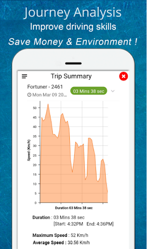 4. TRIP SUMMARY - Get Speed Graphs with Minimum, maximum & Average speed in a journey. Records of Journey. Improves Driving skills with an objective to save fuel and reduce maintenance cost.