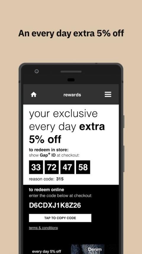 Gap+ loyalty app gives you an exclusive every day extra 5% off* (including most promotions), 50% off on the week of your birthday*, as well as exclusive offers tailored to your likes and delivered to your phone.