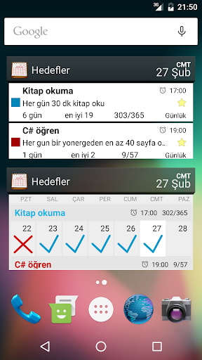 Widgetlar (yalnızca Android 4.0 ve üzerinde çalışmaktadır). Alışkanlıklarınız / hedefleriniz parmağınızın ucunda.